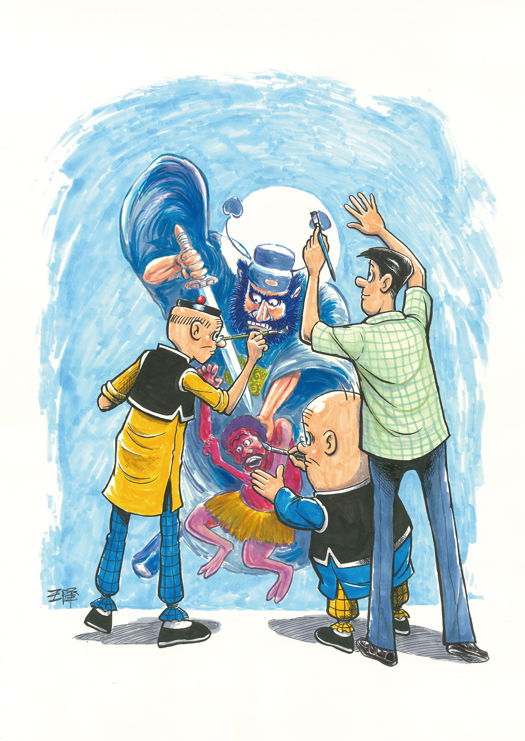 作品简介:《老夫子》漫画风靡华人世界近半个世纪,是香港的文化名片。原作者王家禧先生,他使用长子王泽的名字发表《老夫子》漫画,一直畅销不衰,至今已接近60载春秋。随着王家禧先生年纪渐老,长子王泽开始接力创作《老夫子》漫画。目前馆藏作品大部分为漫画出版物封面原稿,也有部分近年来王泽先生使用丙烯颜料创作的新作,它们是具有当代艺术风格的《老夫子》独幅绘画。