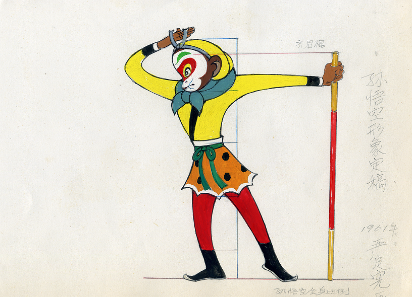 作品简介:《大闹天宫》是上海美术电影制片厂于1961年到1964年制作的一部彩色动画长片。取材经典,色彩浓厚且造型奇异,刻画孙悟空形象鲜明,具有独特艺术色彩,该片是中国动画史上的丰碑。美猴王形象最初由张光宇大师设计完成,后由原画组组长严定宪在此基础上进行了修改和完善。图为严定宪的美猴王人物设计稿。