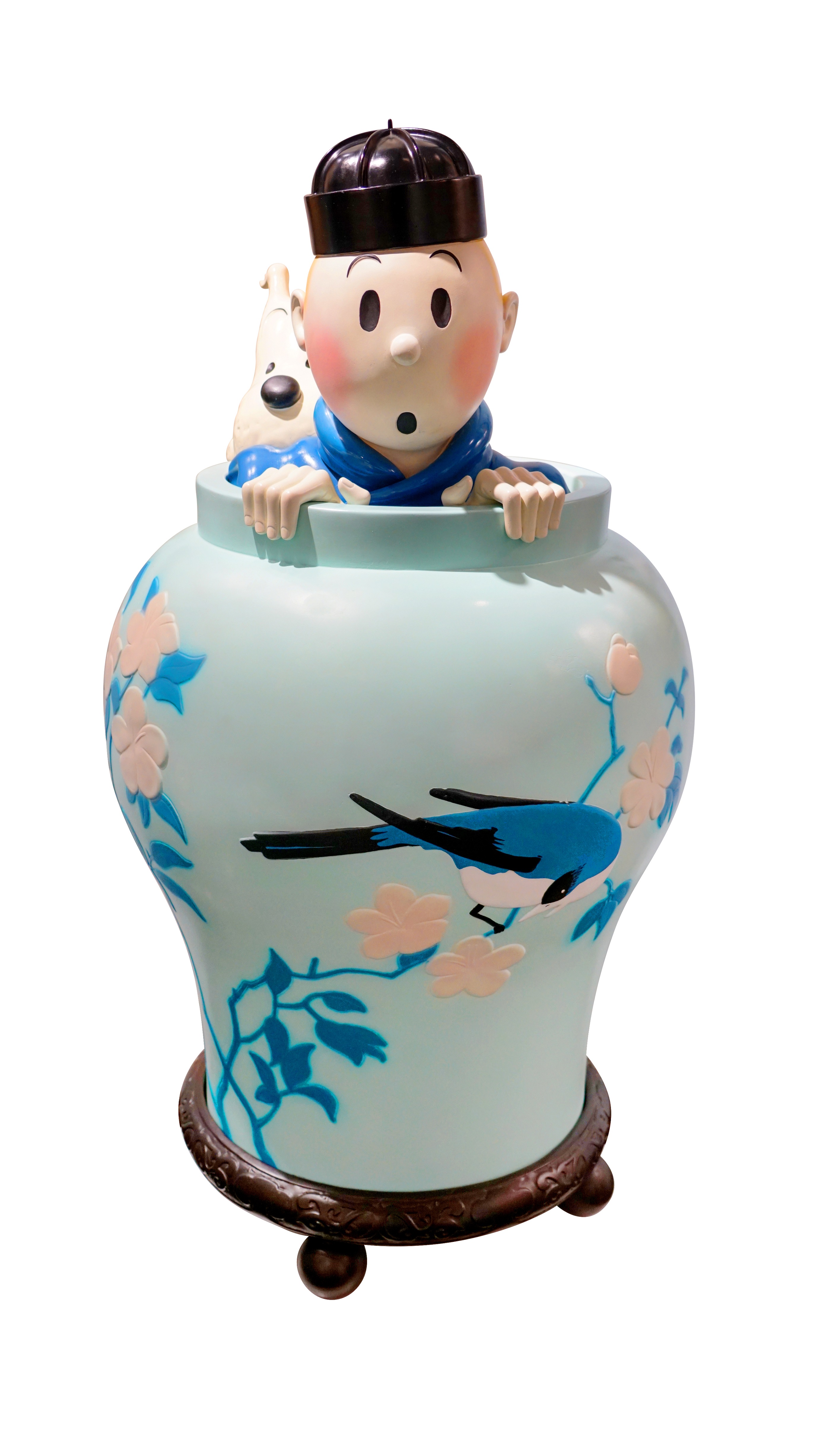 作品简介:由雕塑艺术家Jean-Marie Pigeon制作并亲笔签名的《丁丁历险记·蓝莲花》彩色石膏雕塑,这件作品,根据实际尺寸重现了丁丁系列作品中最具有传奇特色的画面:丁丁和米卢藏在一个大瓷花瓶里。作品全球只有4件,远渡重洋从巴黎运抵广州。